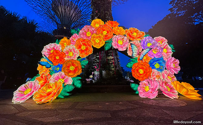 There is also a lantern arch featuring flowers and butterflies at the Supertree Grove. Inspired by the Chinese phrase “花攒锦聚” (huā cuán jǐn jù), Colourful Blossoms symbolises wishes for unity and harmony.