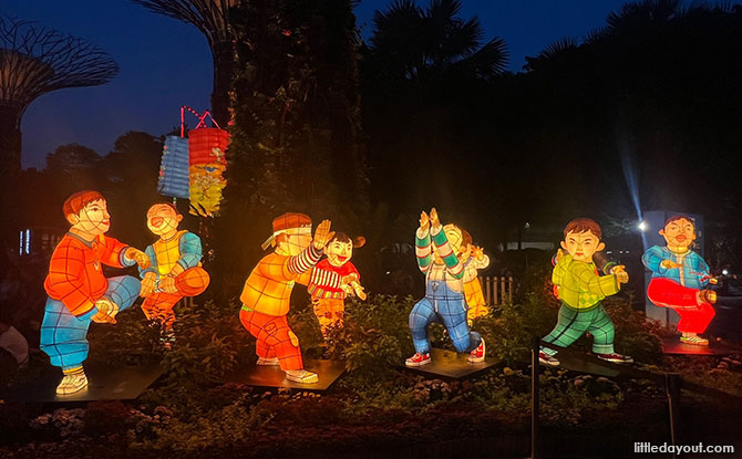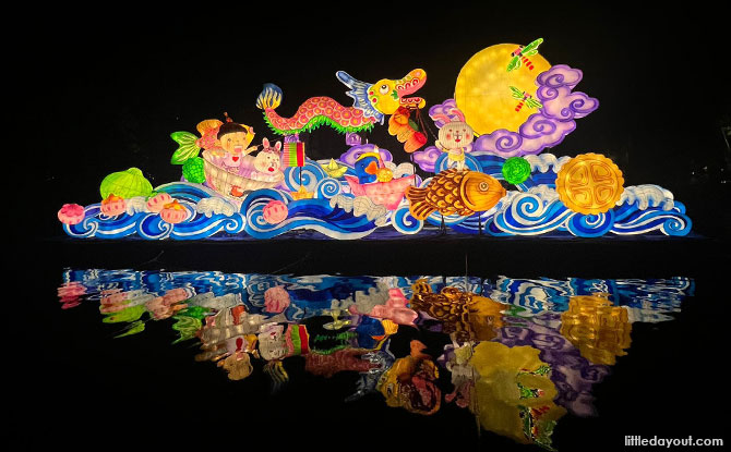 Finally, at Dragonfly Lake, is a lantern set that is inspired by Singaporeans’ unique way of life in HDB flats. You can find Ang Ku Kueh Girl and all her friends here, playing with lanterns at a HDB block with the address 60 for SG60.