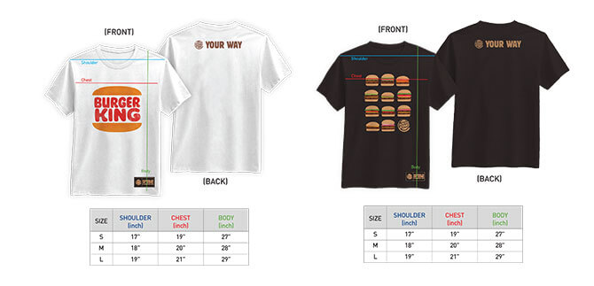 The Burger King T-Shirts comes in two designs. The white version comes with Burger King’s logo on the front. The black version has 11 burger icons on the front. It is available in three sizes – small, medium and large.
