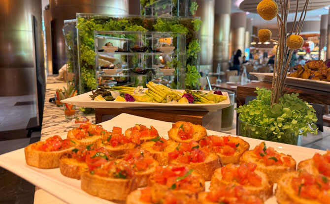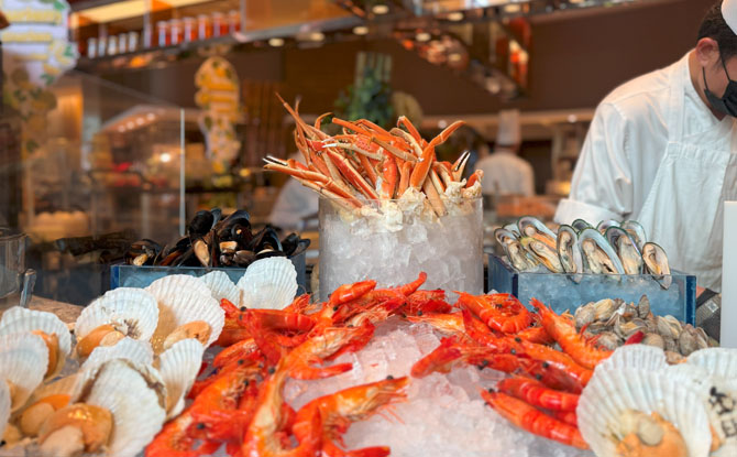 But the standout experience? The Epicure Sunday Brunch. Eighteen live stations, from freshly shucked oysters and seafood on ice, to Josper-grilled wagyu and octopus. There are two price tiers (with or without alcohol), which is thoughtful for different groups. For us, the real treat was the kids’ corner—a dedicated space with a mini basketball hoop, building blocks, colouring activities, a popcorn and candy floss machine, and even a screen playing cartoons.