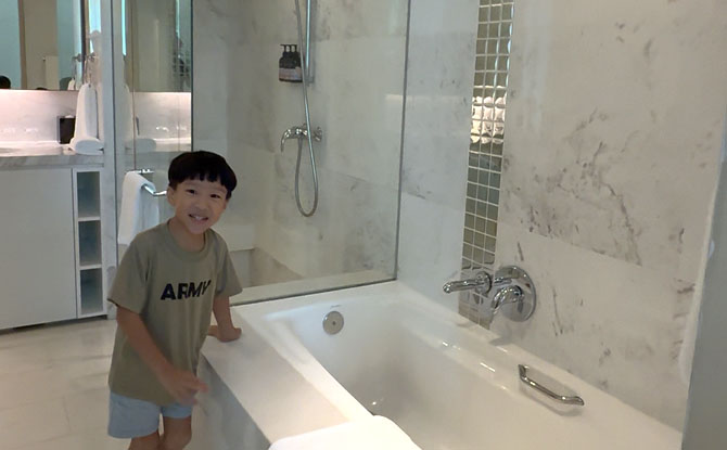 The bathtub was another highlight. Ever since their bath bomb memory in Japan, the Boays equate hotel tubs with playtime. No bath bombs this round, but the joy of splashing around in warm water remains timeless.