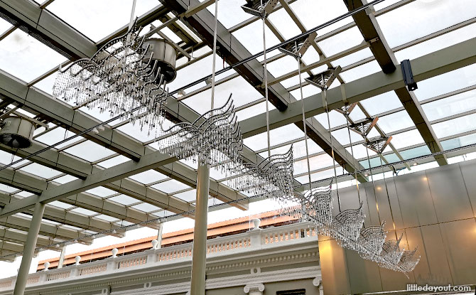 Spot the swinging chandeliers at level titled Wings of a Rich Manoeuvre by Suzann Victor. The eight mesmerising wing-like chandeliers swing in choreographed oscillations based on harmonic motion. It marks the passing of time to the past then to the present.
