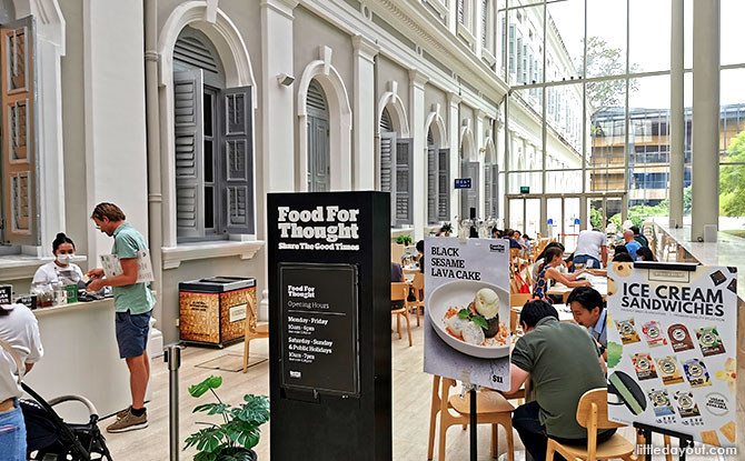 There are a few food and beverage outlets at National Museum of Singapore located at level one – Food for Thought and Flutes. Food for Thought is a family-friendly café with meal and dessert options. The latter is a fine-dining restaurant.