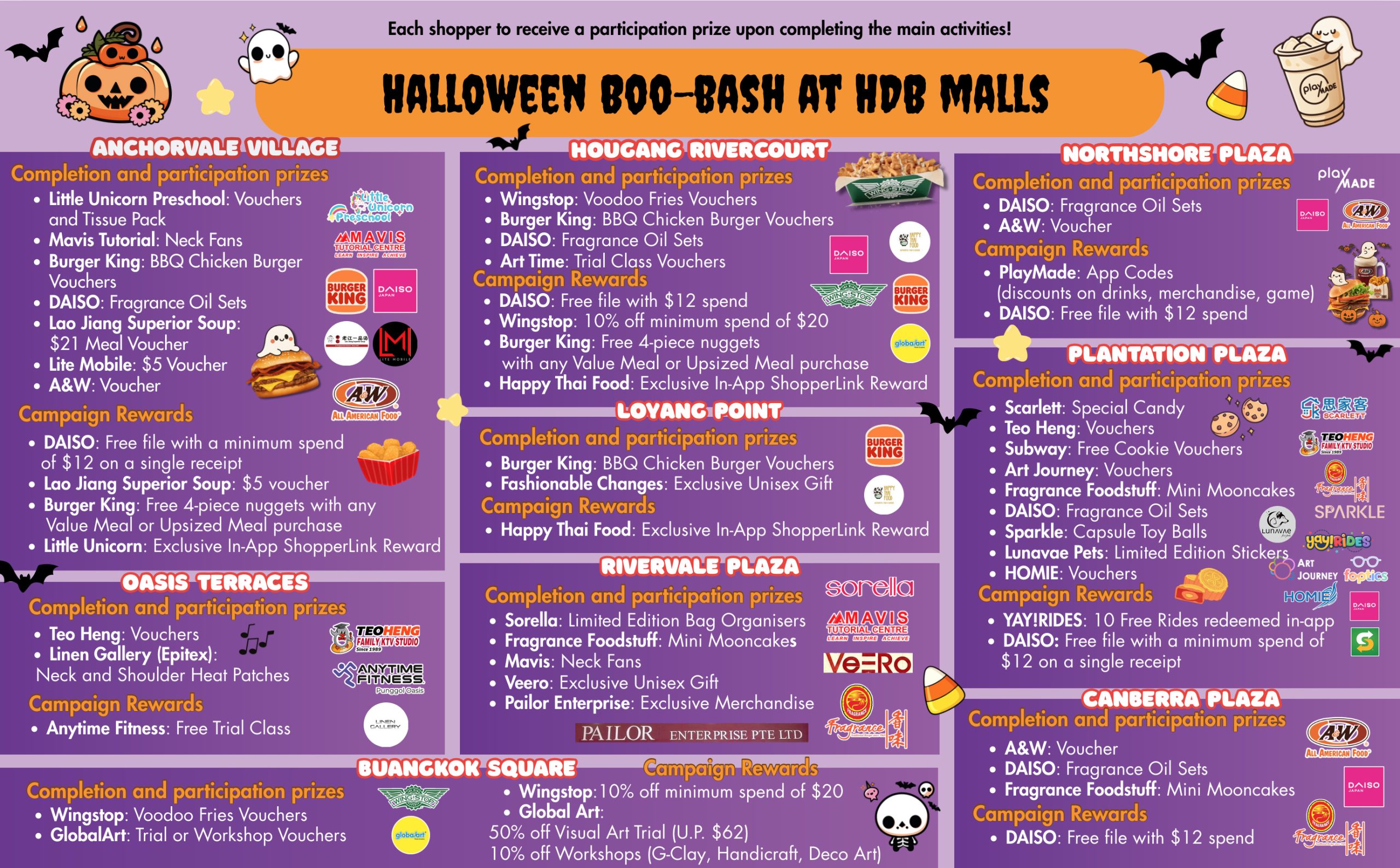 Stay updated with the latest information about Halloween Boo-Bash by following Anchorvale Village, Buangkok Square, Canberra Plaza, Hougang RiverCourt, Loyang Point, Northshore Plaza, Oasis Terraces, Plantation Plaza and Rivervale Plaza on Facebook.