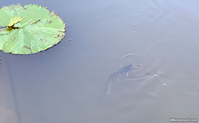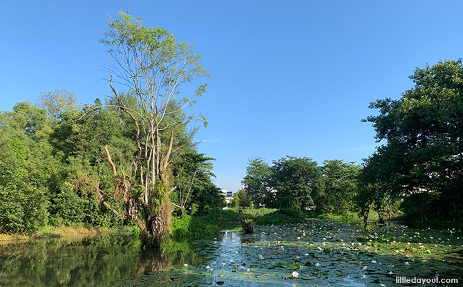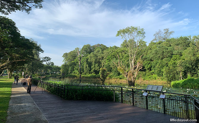 The lake is set against a green forest backdrop. The lack of tall buildings, thanks to nearby Seletar Airport, make for a beautiful scene.