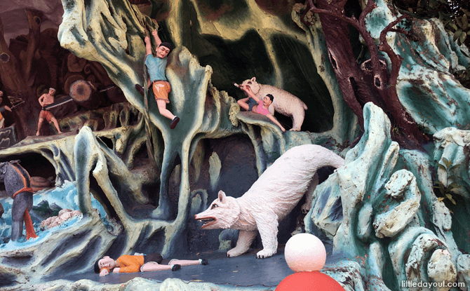 Pause and read the signboards to interpret the dioramas and tableau of Chinese folktales and legends in front of you.