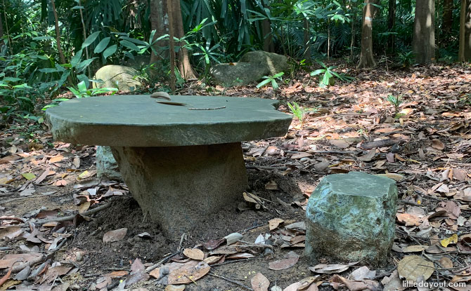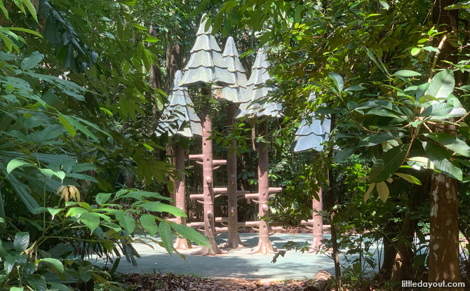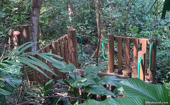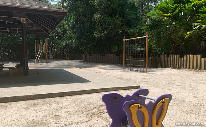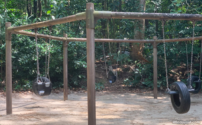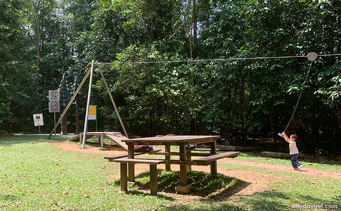 A fun zip line can be found in an open lawn with picnic tables nearby. Do take note that the zip line ends off rather abruptly at the end. Therefore, it is only recommended for children who are able to hang on tightly and brace for the sudden jerk at the end.