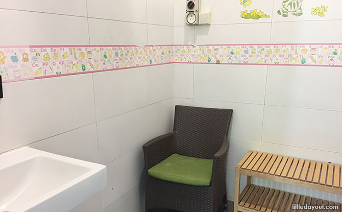 Airy and clean, the HortPark nursing room is equipped with a sink, chair, electrical point, wooden bench and a foldable diaper changing station. Nevertheless, it is still quite functional and suited for quick diaper changes and provides a private place for mothers to breastfeed or express. Do note however that there is only one HortPark nursing room available which may be inconvenient if the room is occupied and it is only accessible by females due to its location within the female restroom.