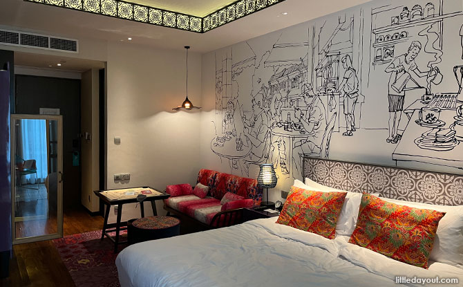 The beautiful connecting rooms are well-designed and large enough for a few rounds of hide and seek with the kids! With wooden flooring, Peranakan tile designs bordering the ceiling, vivid urban sketches of Katong scenes graced the wall.