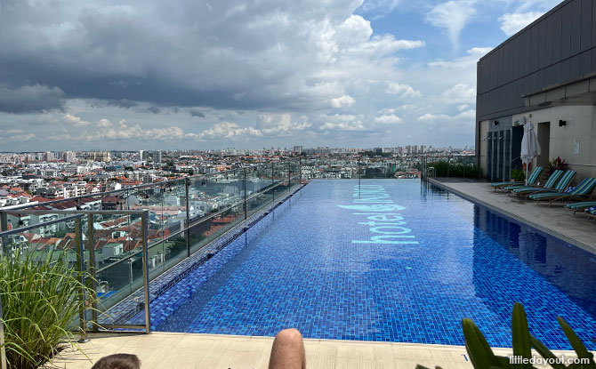 The hotel rooftop overlooking Katong town, its skyline and parts of Singapore afford a great view for guests to unwind, with a clear 1.2 metre deep infinity pool and an alfresco seating space with trees creating a dappled sunlight effect.