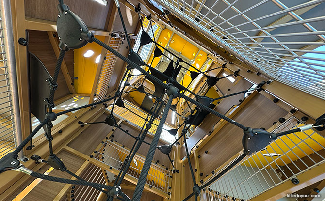Inside the Hougang Citrine Otter Playground, kids can cross a rope bridge that leads to a higher platform at the rear of the playground where the haunches would be.