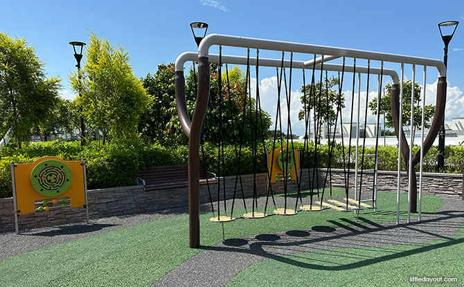 It is a simple affair with play panels as well as a set of hanging steps that kids can use to challenge themselves as they cross the wobbly elements.
