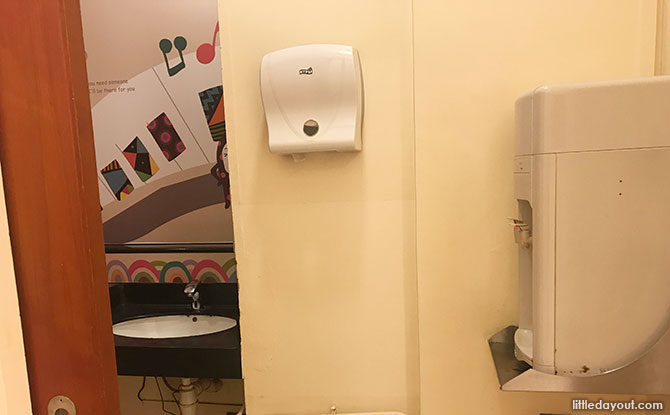 The nursing room at Hougang Mall is brightly coloured and furnished with a hot and cold water dispenser, a sink, a padded diaper changing mat, four electrical points and an armchair. A curtain can be drawn around the armchair to create a space for nursing mothers to breastfeed. The nursing room can also be locked to ensure greater privacy and comfort for nursing mothers to breastfeed or express in peace.