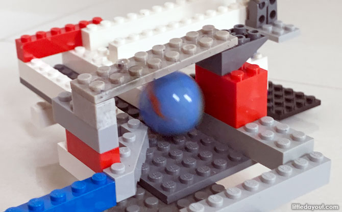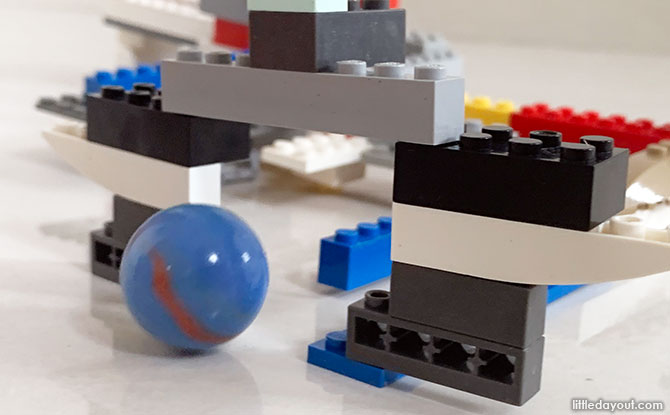 For our LEGO Marble Rollercoaster build, we made use of a larger size marble. It was large enough so that it could use of two pieces of LEGO, spaced apart by two studs, as a pair of rails for the marble to roll along.