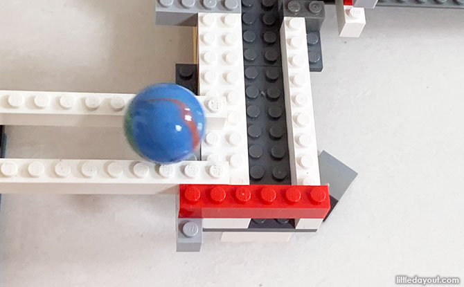 We also used boards to create a ramp for the marble to roll along. A set of guard rails made up of LEGO pieces, spaced apart by three studs, helped to keep the marble rolling within the channel.
