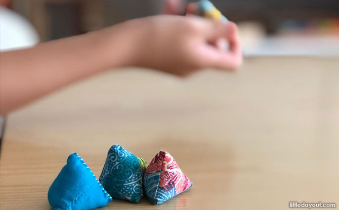 The game of 5 stones is believed to have originated in Ancient Asia and is now known as one of the popular and well-known childhood games played during the “kampong days”. It is often played by two or more players using five small beanbags referred to as “stones”. It’s a great game to build concentration and dexterity. There are many variations of patterns that can be done. Here is one way to play Five Stones.