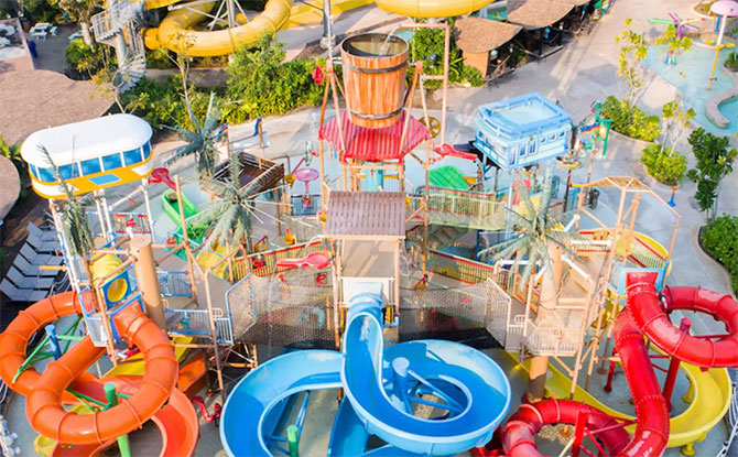 The water park also has fast food restaurants, bars, a massage pavilion, and shopping options.