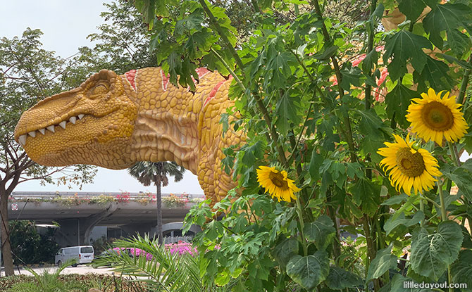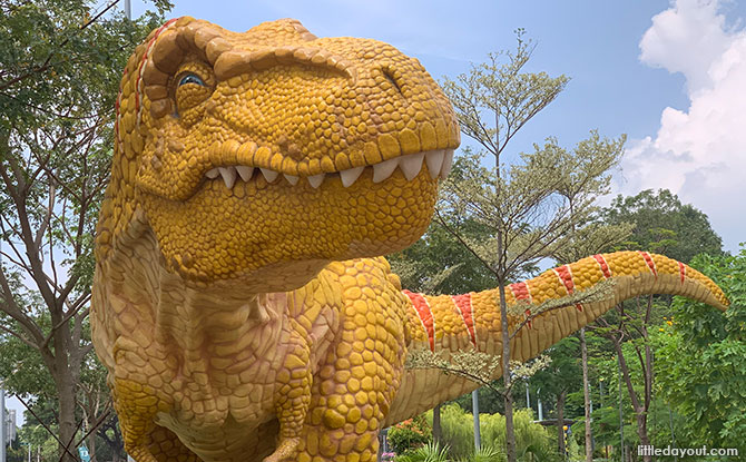If you have visited Changi Jurassic Mile recently, you may feel a bit “caged up” with the safety netting stretching all over the walkway. For those who like their prehistoric creatures uncaged, we recently spotted several dinosaurs, including a large yellow T-rex that you can get close-up with, along the Changi Airport Connector.