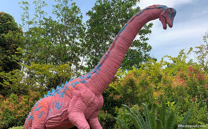Not all the dinosaurs are small. There is a large, blue-and-red sauropod which towers by the pathway too.