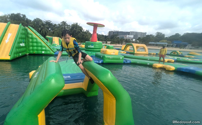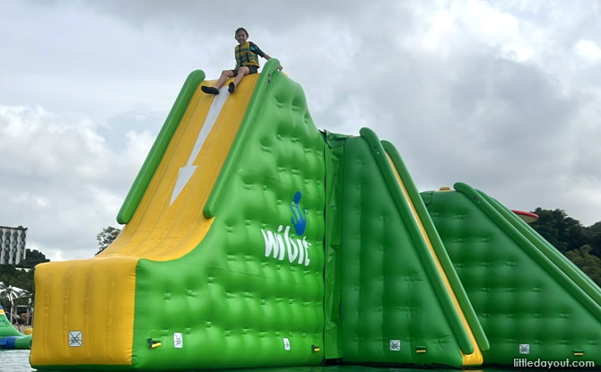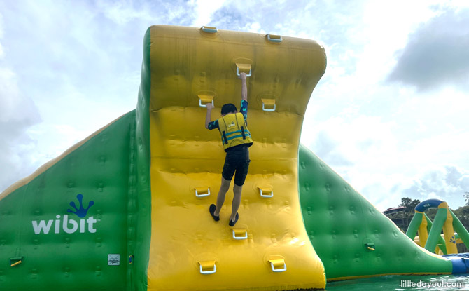 If slides, balancing beams, splash zones are not enough. Try climbing up the tower from the water. This was probably the most challenging bit of HydroDash. If you are thinking of using your feet to help, wear aqua shoes to prevent cuts from barnacles at the base of the float.
