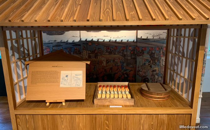 In the first room, there is a mock-up of a sushi stall from the Edo period along with displays outlining the history of sushi.