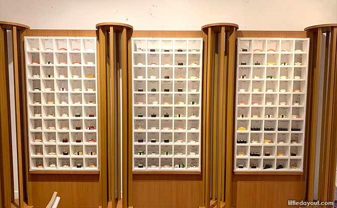 There are 150 types of sushi displayed like matchbox cars. See if you can find your favourite.