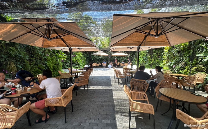 The seating area at Ice-Cream Man And Friends Garden Cafe is made up of tables and wicker chairs under broad umbrellas that provide welcomed shade.