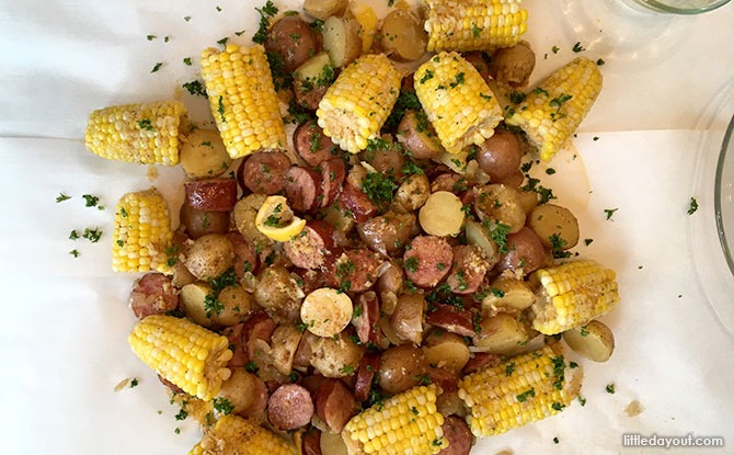 - Time to assemble the dish. Apply layers of baking sheets on the table, spoon out all the seafood, potatoes, kielbasa and corns on it.