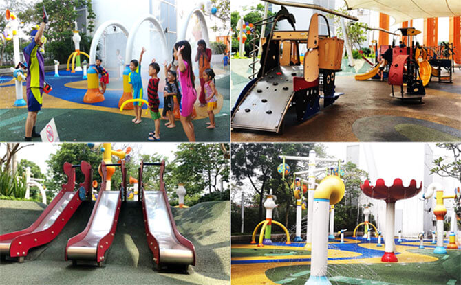 Rooftop playground and Splash Park are located at Level 3 and open to children under 12 years old. Splash Park activation hours are from 11 am to 2 pm & 5 pm to 7 pm.