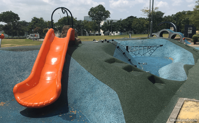 There are also climbing ropes, fitted with knobs for little hands to grip on to, around the mounds. At the top of one of the mounds is a faux rock platform and a bright orange slide that promises a short ride downwards.