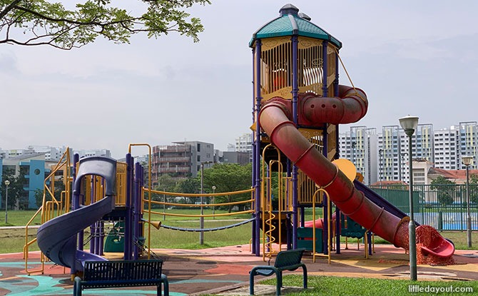 The Jalan Bahar Park Playground has a tall yellow tower with red enclosed slides. At the lower level of the play tower, there is a bridge which connects its to another shorter structure on the other side.