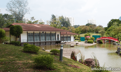 Past the Dry Garden is a traditional Japanese Rest House. This open structure is set against the backdrop of a lotus-draped pond. A white stone bridge and red wooden bridges span the pond gracefully, leading to sheltered pavilions on the other side. Kids will enjoy clamouring over the arch of the bridges and making their way from one side of the pond to the other.