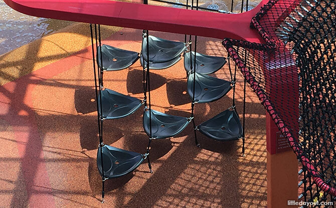 There are also triangular-shaped rubber hammock that play dual-purposes: as stepping stones or hanging seats for kids to play on.