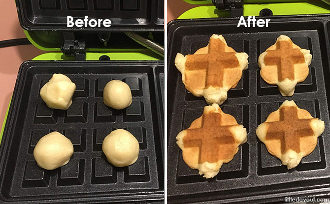 - Then place a dough on each cross joint of the waffle maker and close the cover.