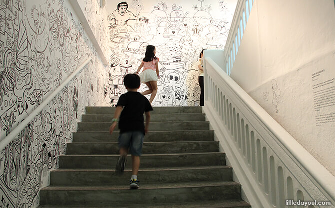 As you head up the stairs to the second level, you will notice illustrations crawling across the walls all the way up to the fourth level of SAM at 8Q, adorning every wall. Imagine-a-doodle by the Singapore collective Band of Doodlers tell the stories of Singapore’s folklore and an imagined vision of the future.