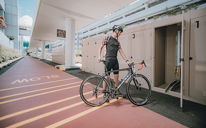 The end point of Changi Airport Connector is at HUB & SPOKE Changi Airport, a new facility at the southern end of Terminal 2. This hub is also where visitors can rent bicycles, cool off with a shower after exercise, or have a meal with family and friends.