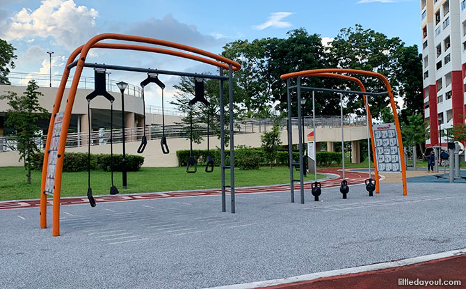 Another interesting element at the Jurong Spring Neighbourhood Park Playground is an orange netted play structure. This low rope structure has interesting dips which kids can climb up and down.