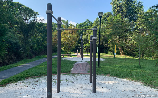 Close to Carpark B, there are a series of exercise stations along a terrace at Kent Ridge Park.