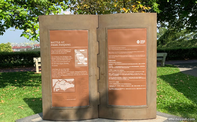 As Kent Ridge Park is the site of a historic battle in the last days before the fall of Singapore, National Heritage Board has erected a WWII marker which outlines the events that took place on the ridge. It can be found beside the car park next to the look out point.