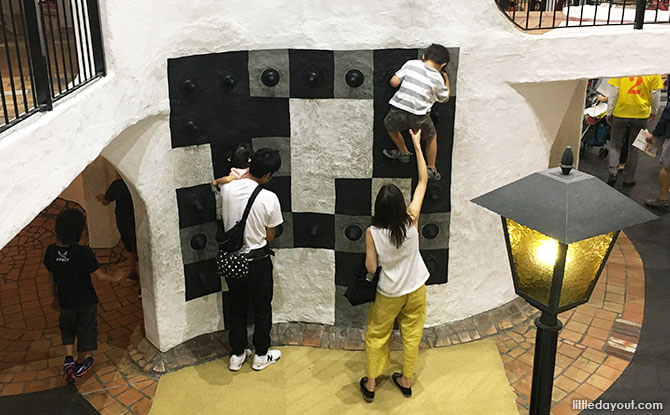 Venture across a red suspension bridge to reach the central tower, scale the walls or peek out from one of Kids Town’s many windows and archways.
