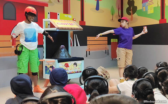 Science experiments were also peppered throughout the performance. Jo likened her anger to a volcano, or the effect of mixing vinegar and baking soda. Jo and Win also showed how disagreements were like two repelling magnets, while compromising was like two attracting magnets. The visuals of the performance helped children to understand the relationship between science and emotions.