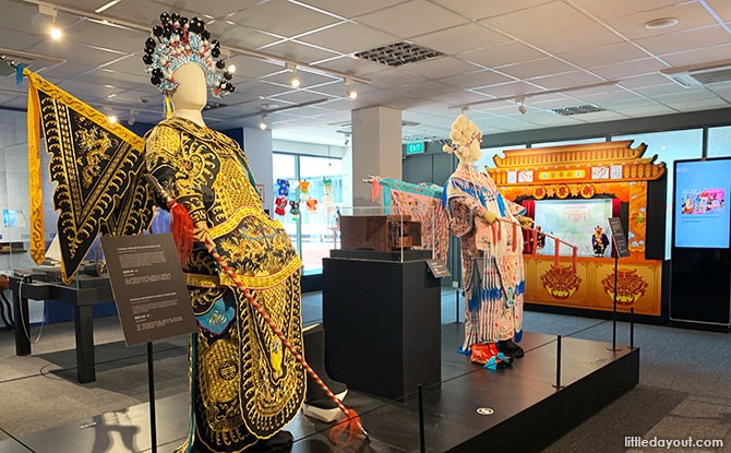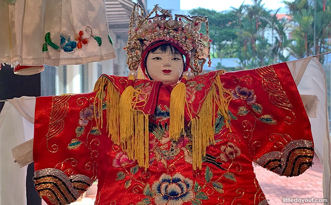 The Kreta Ayer Heritage Gallery has a Chinese puppet theatre display with two string puppets on the stage.