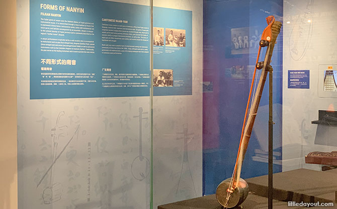 Nanyin or music of the south was brought to Singapore from the Fujian province in the 1800s. This art form makes use of instruments like the pipa, sanxian and ban to accompany a soloist. These instruments can be viewed at the Kreta Ayer Heritage Gallery.