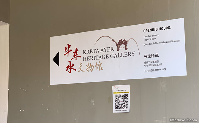 Kreta Ayer Heritage Gallery Opening Hours: Tue to Sun, 12 pm to 8 pm. Closed on Public Holidays and Mondays.