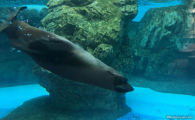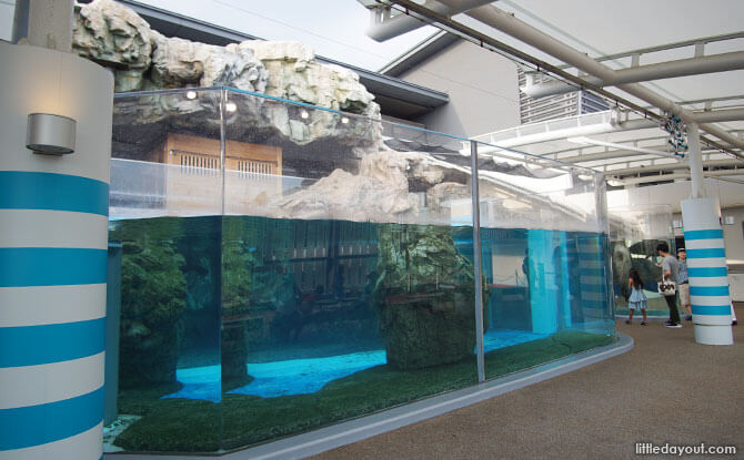 From here, head outdoor to view fur seals at an outdoor enclosure. You can also view earless seals in a tubular pool nearby.
