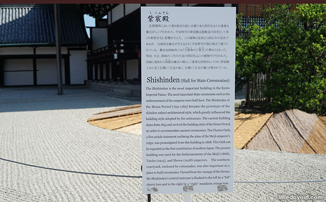 Beyond the Shishinden, the tour route continues past buildings such as the Hall for Rites and Rituals, the Palace for Study and Other Ceremonies and the Imperial Residential Palace.