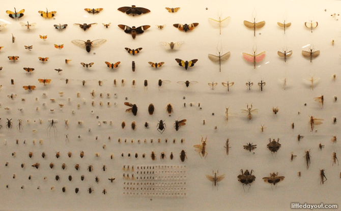 Move out of the water and into the kingdom of insects. There is an overwhelming assortment of beetles, butterflies and bugs on display. This is no wonder since the insect kingdom is the largest among the world’s animal groups. Other than those pinned on the wall, see if you can spot the ‘live’ stick insects on display too.