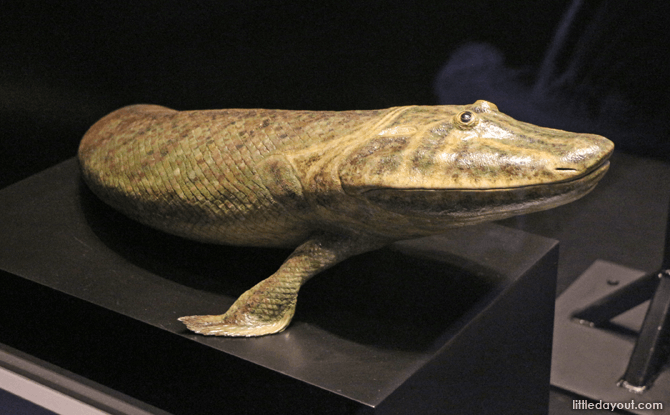 Tetrapods are four-footed animals. Showcasing how limbs are able to support the heavy mass of a body on land, look out for exhibits such as the leg and foot of an Asian Elephant and the fossil leg of a triceratops. There is also a model of a Tiktaalik, a freshwater fish that had wrist-like fins and could prop itself out of the water. For a more current example of amphibious fish, there is a collection of mudskippers in the glass tank opposite the model.