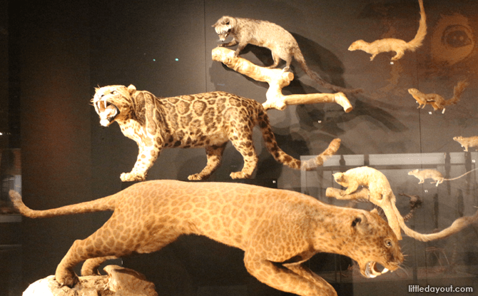 The mammal gallery focuses on animals found in the Southeast Asian region. Taxidermically preserved animals here include big cats such as tigers and leopards, as well as smaller mammals such as the binturong and porcupines. Visitors can also view the skeleton of a dugong, a marine mammal, and even touch the skull of an elephant.