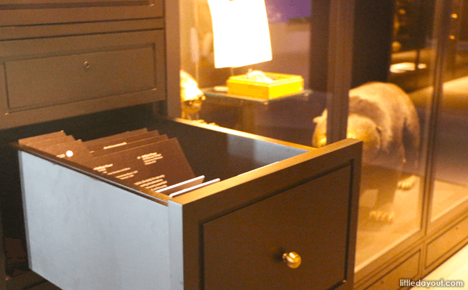 The mezzanine floor of the Lee Kong Chian Natural History Museum pays homage to its heritage. Its decor is reminiscent of an old-style museum with specimens on display in dark wooden cabinets and curator cards filed away in drawers.